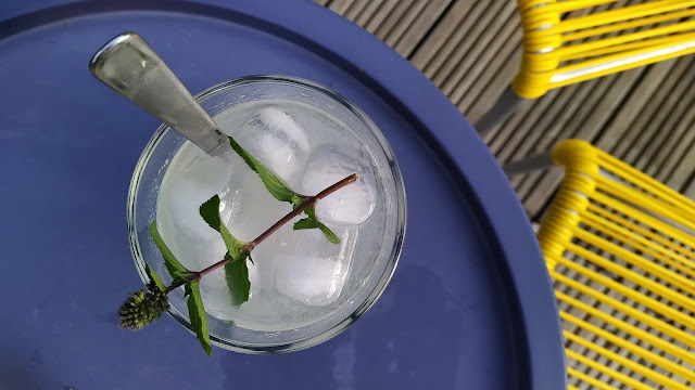die tochter ist im schwimmtraining, kai trifft sich mit einem freund - und ich mache es mir mit einem moscow mule am bädle gemütlich. ist minze ein arger stilbruch? wäre zitronenmelisse besser gewesen?